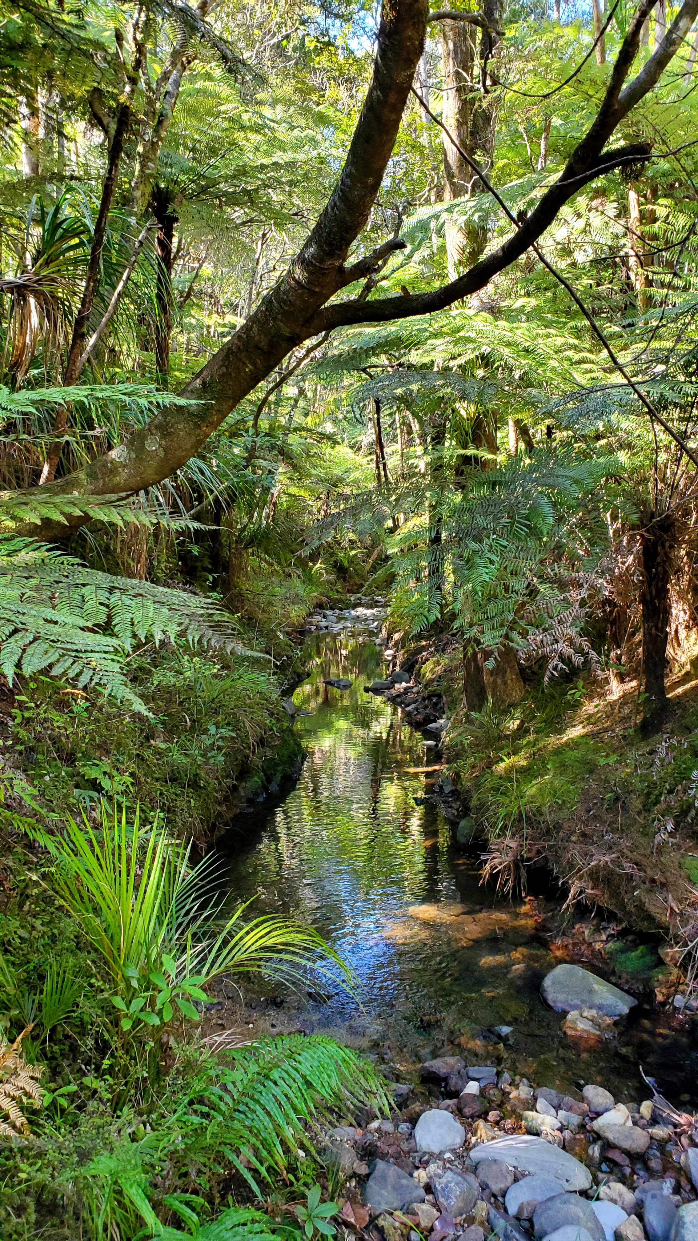 I was most focussed on this for the day, having read it included quite a lot of uphill. It did, but they were short sharp climbs and manageable. The trail seemed to be an old road Ian noticed – perhaps used for forestry back in the day. He had some great stories about his great grandfather who had worked in the logging industry back in the day. The bush was regenerating, and there was plenty of manuka coming up, with Kauri and other trees growing in places. It was a much more pleasant bush walk than I expected, lovely underfoot after the roads. We also passed the 300 km mark!