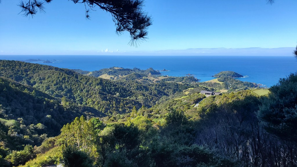 After a brief gravel road section, the DOC signposted ‘Morepork Track’ began. The sign said one way, 4.6km, 2 hours. It too began with a lovely, wide, easy trail through more bush. Oddly there was no signposted end to this trail, it just seemed to merge into a far more typical tramping track, through private property. This track careered up and down very steeply though, there was no zigzagging to be had! ‘Killer Morepork’ is perhaps a bit harsh as that 4.6km was lovely, but this day really had a nasty sting in the tail.