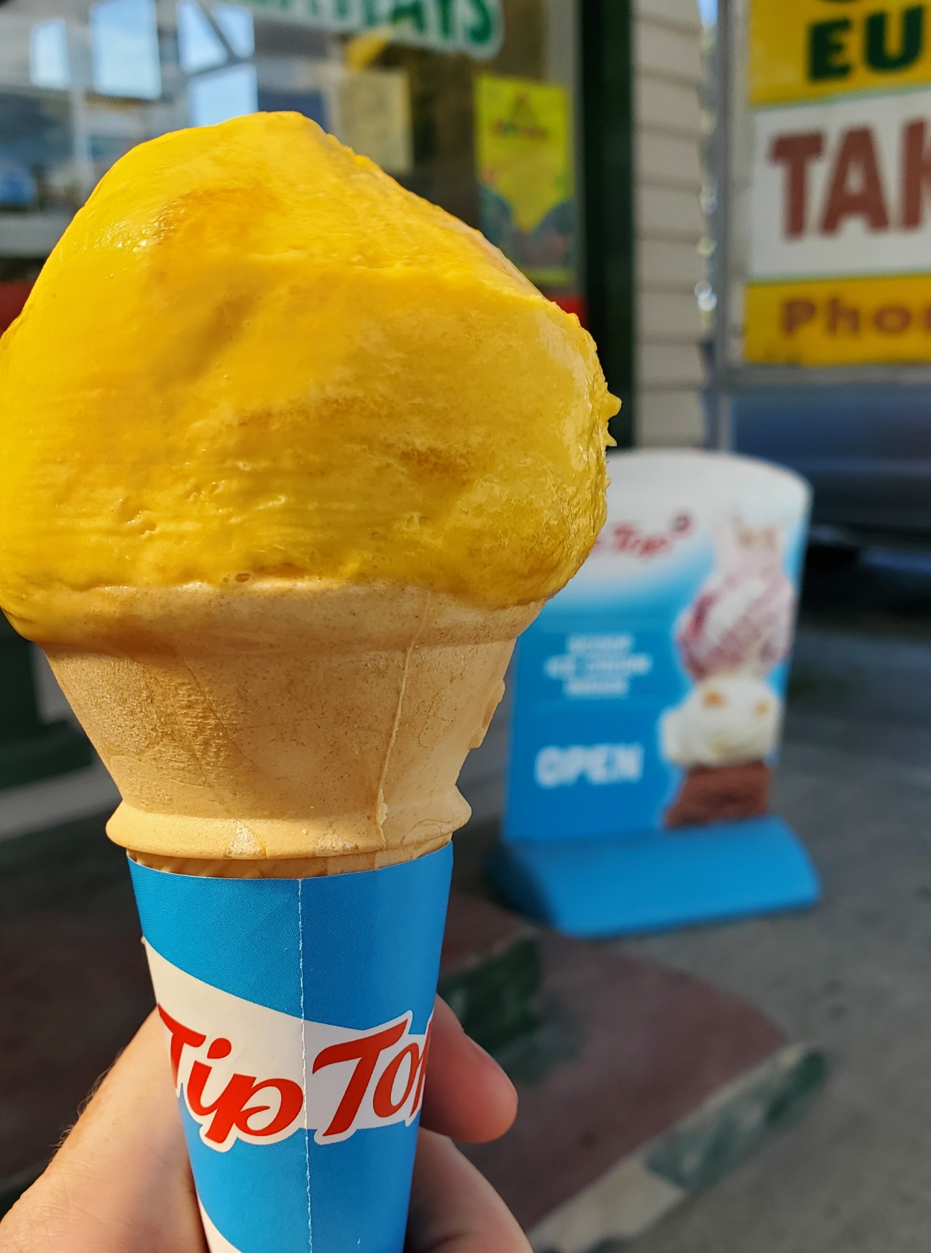 Waipu has a heavy Scottish influence from its founding settlers, so there is Gaelic on some of the town signage. I finally got the toastie cheese sandwich I’d been craving since a few days ago, and branched out to try a mango flavoured ice cream.
