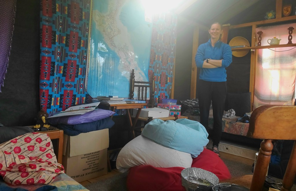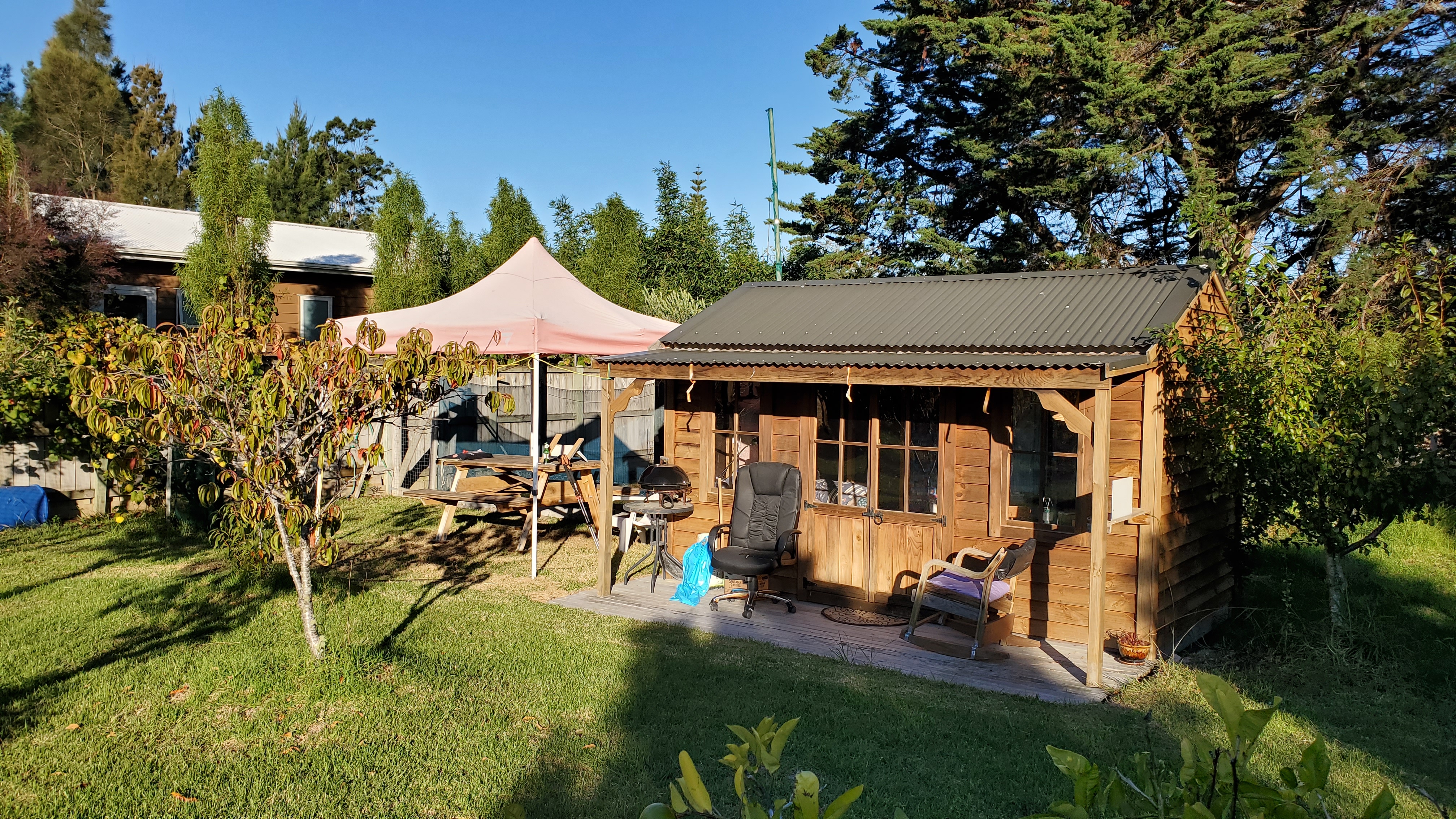 Around 6 pm I finally got to tonight’s accommodation. It’s a wee cottage in an orchard next to Mark & Kerry’s house. They did Te Araroa a few years ago, and have been hosting walkers for a couple of years now. It’s such a perfect set up – comfy bed, solar shower, flush toilet, electricity & kettle in the cabin, and two cute rabbits. Inside the cottage reminded me of our family holiday house, it had a wooden smell. Mark even gave me a cold beer, which I was careful to drink slowly, and not end up on the floor in my dehydrated state! It was nice to chat to them though.