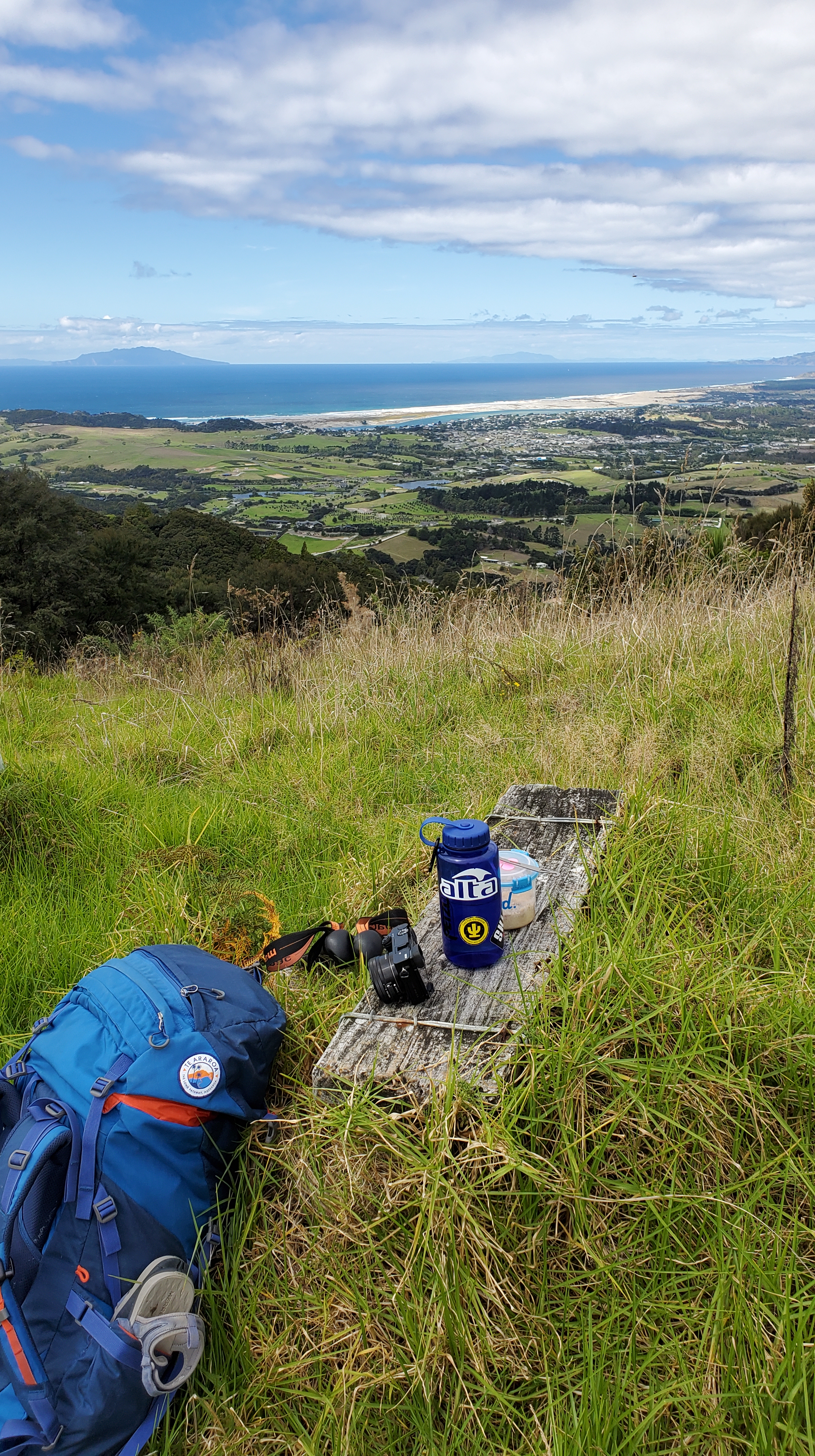 After that a DOC track called Langsview Track started. It had some birds, and was a nice forest trail at first. Just after passing a high point, views of the coast ahead appeared! It was a good place to stop for lunch, while realising I still had some distance to go looking down at Mangawhai.