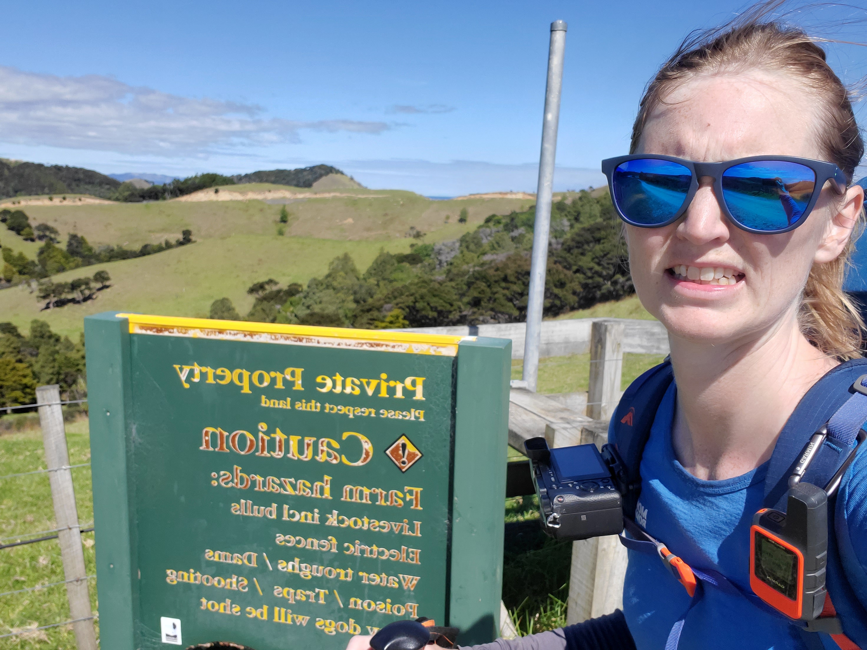 Then came a brief road walk, and up another gravel road to the farm section. Of course I was dreading this part, especially after some big steers all ran across their paddock to the fence and water trough, and pawed the ground as I passed up the road. Then I got to the DOC sign listing hazards, and sent a satellite location message to Mum so they could find my trampled body easily if the worst happened!
