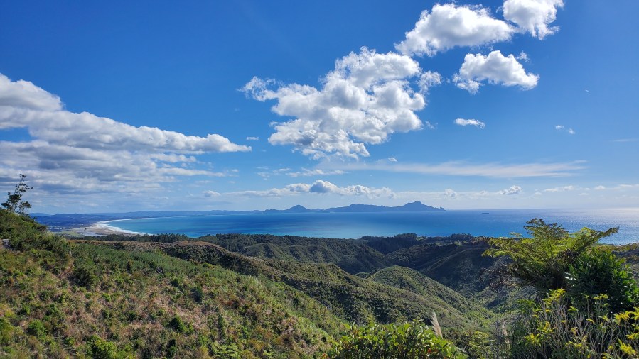 I headed back to where I left off the trail yesterday, and seemed to be there in no time at all. The road climbed steadily but not steeply, and it was mostly just me and some mountain bikers on a sleepy Sunday morning. It became a gravel road leading mainly to a huge subdivision, but the views in the distance were stunning. Te Whara / Bream Head where I’d been walking two days ago was clearly visible, as was Ruakaka Beach.