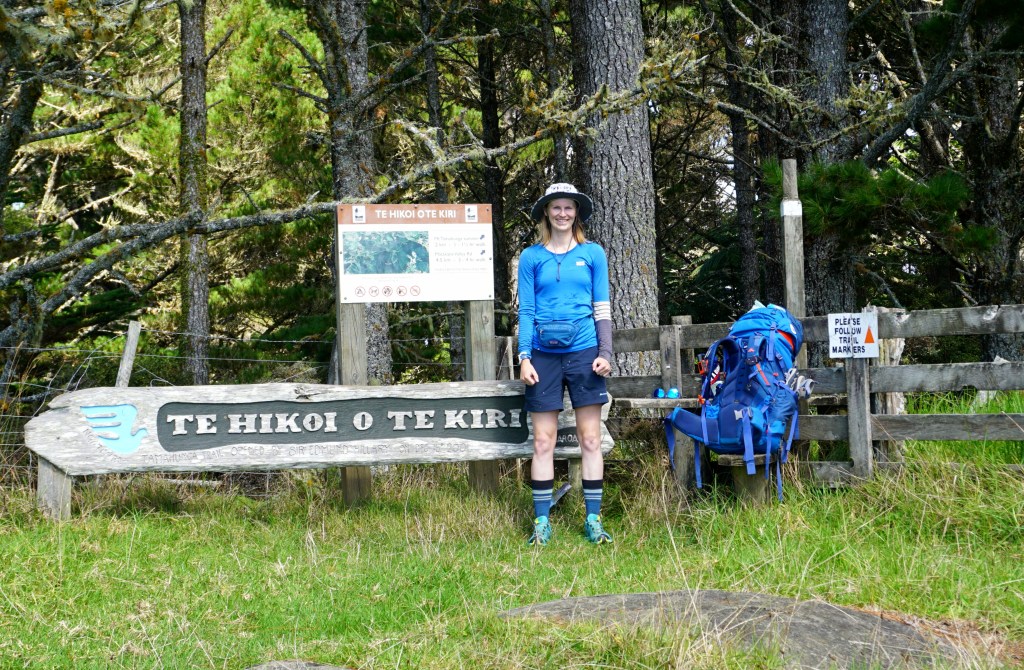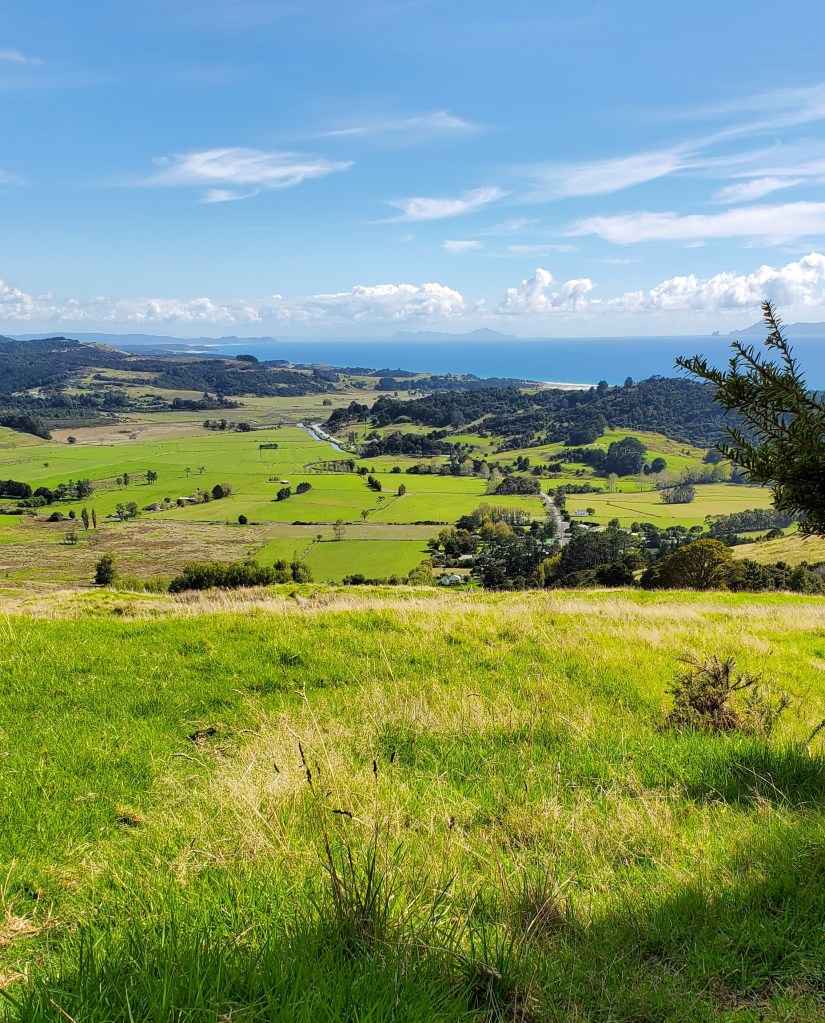 After following a gravel road alongside the river, passing the cute little Pakiri School, it was time to head uphill. This part climbed steeply through farmland to join the main section of track. At least the grass was soft, but my legs sure felt dead. On the upside, there seemed to only a sole cow, far away. Close to the top the view stretched all the way to Te Whara again! I tried to remember which days I’d walked which parts of the view, while downing aloha trail mix and hoping pineapple power would get me up the hill.