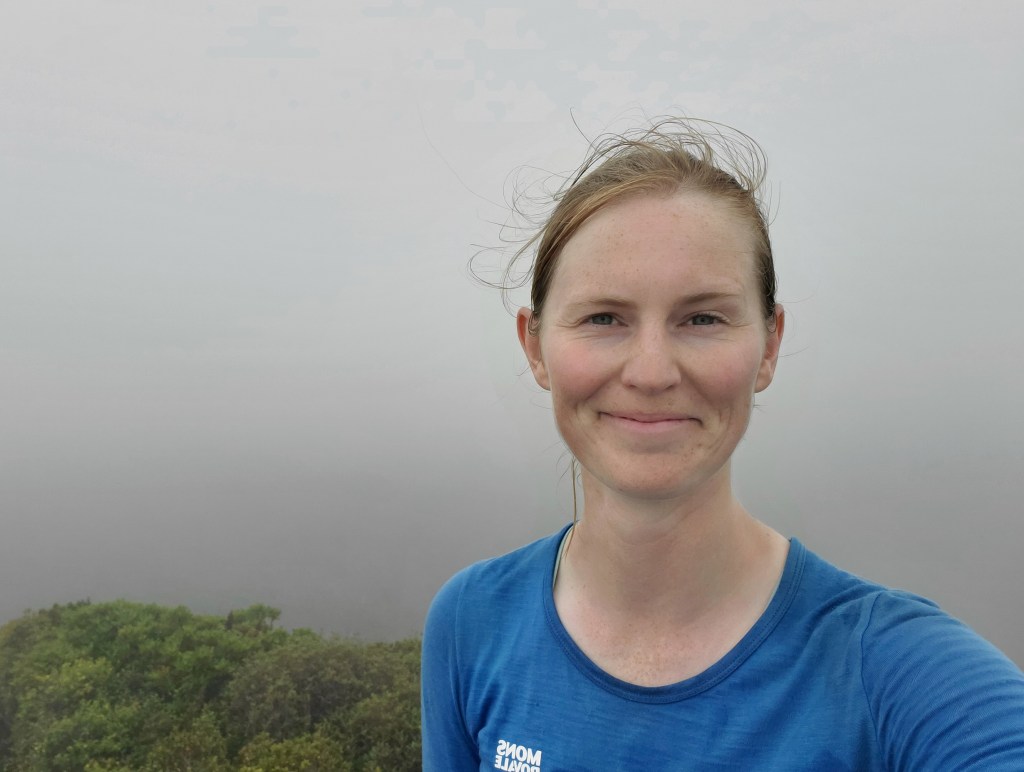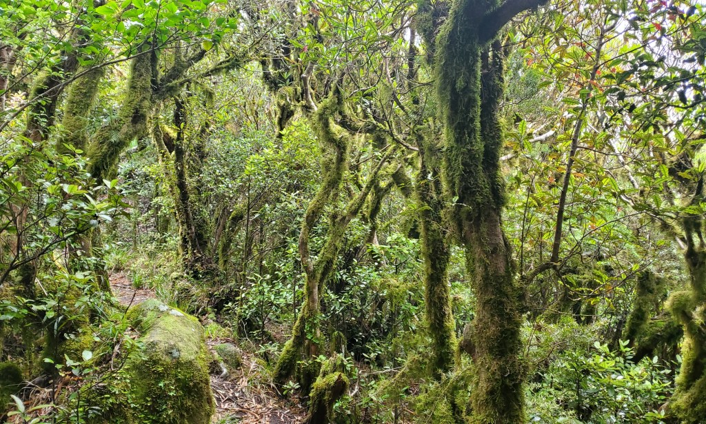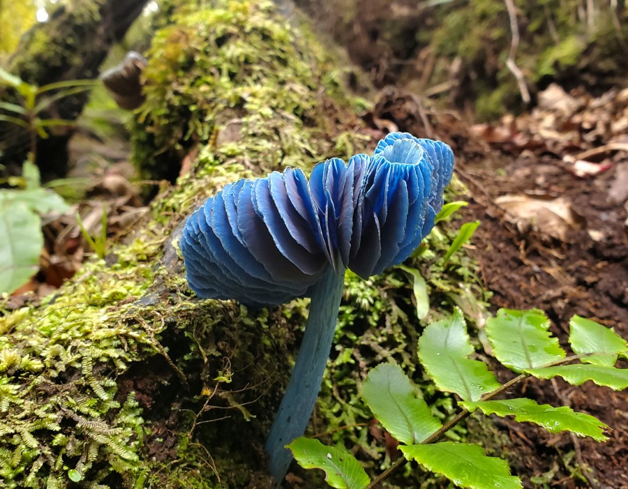 The weather was overcast and the track initially climbed quite gently. I found this a bit trudgy, but I think it was just my mood. The forest was vibrant and beautiful after the recent farmland. I knew towards the summit it got steeper and a bit more challenging, and oddly I enjoyed this a lot more. I think the bit of bouldering I’ve done helps with foot placements, and I quite enjoy the task of scrambling uphill. It was also a surprise to see these bright blue mushrooms here and there!