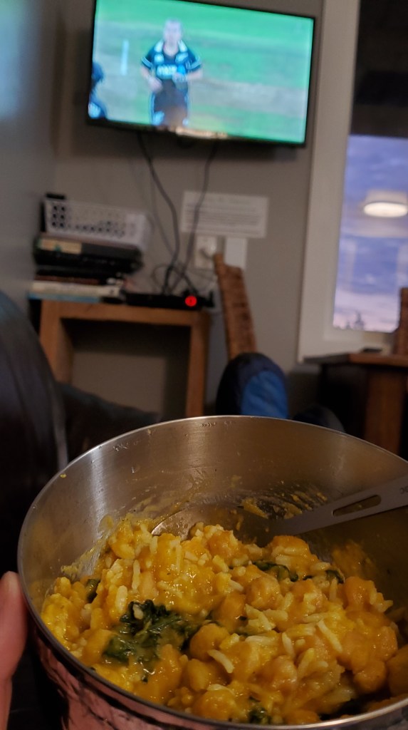 I really wished I could have a rest day here tomorrow since it has everything a tired hiker could want, but unfortunately the weather doesn’t look compatible. The next section of trail is really notorious for being challenging in fine weather, and one that you shouldn’t attempt in wet weather. There aren’t really any road routes around it. The forecast for tomorrow is fine, while the day after tomorrow is for rain sadly, so a rest day doesn’t work. I did my best to make the most of resting this evening, figuring out the Chrome cast to get the cricket on the TV! I also felt grateful for my pumpkin, chickpea, spinach curry which is always a tasty meal. The drawn out process of making pumpkin powder in the dehydrator was worth it.