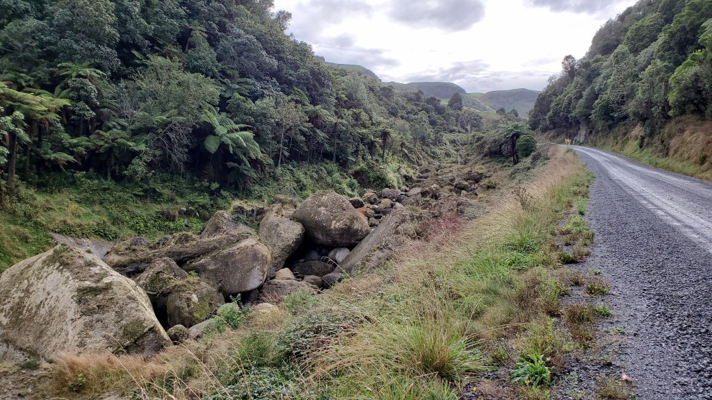 7.8 km is quite a lot of state highway, and I tried not to look at the distance. When the rain was at its heaviest, I was really glad to find a school bus shelter to take cover in and have a good rest. I waited twenty minutes, had some food and set off again in slightly lighter rain.