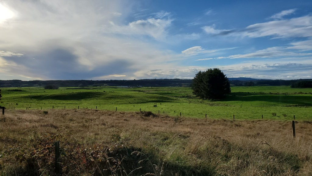 There weren’t many houses for the first two hours, but then there were signs of life and a farm or two. A dog sat out front one of houses next to the road. I tip toed past nervously but it didn’t move. After a few hours the road passed through a farming area that seemed to be run by local Māori. Quite a few friendly farm workers zipped past on farm vehicles. I wondered what happens when a logging truck comes along the road, as about five had. On the farm land there was a sign for ‘Finishing School’. I wondered if this meant fattening up animals, was something to do with vegetables (as it was in fields of kale or something) or helping young people into work? I can’t seem to find anything about it on Google now. Does anyone know?