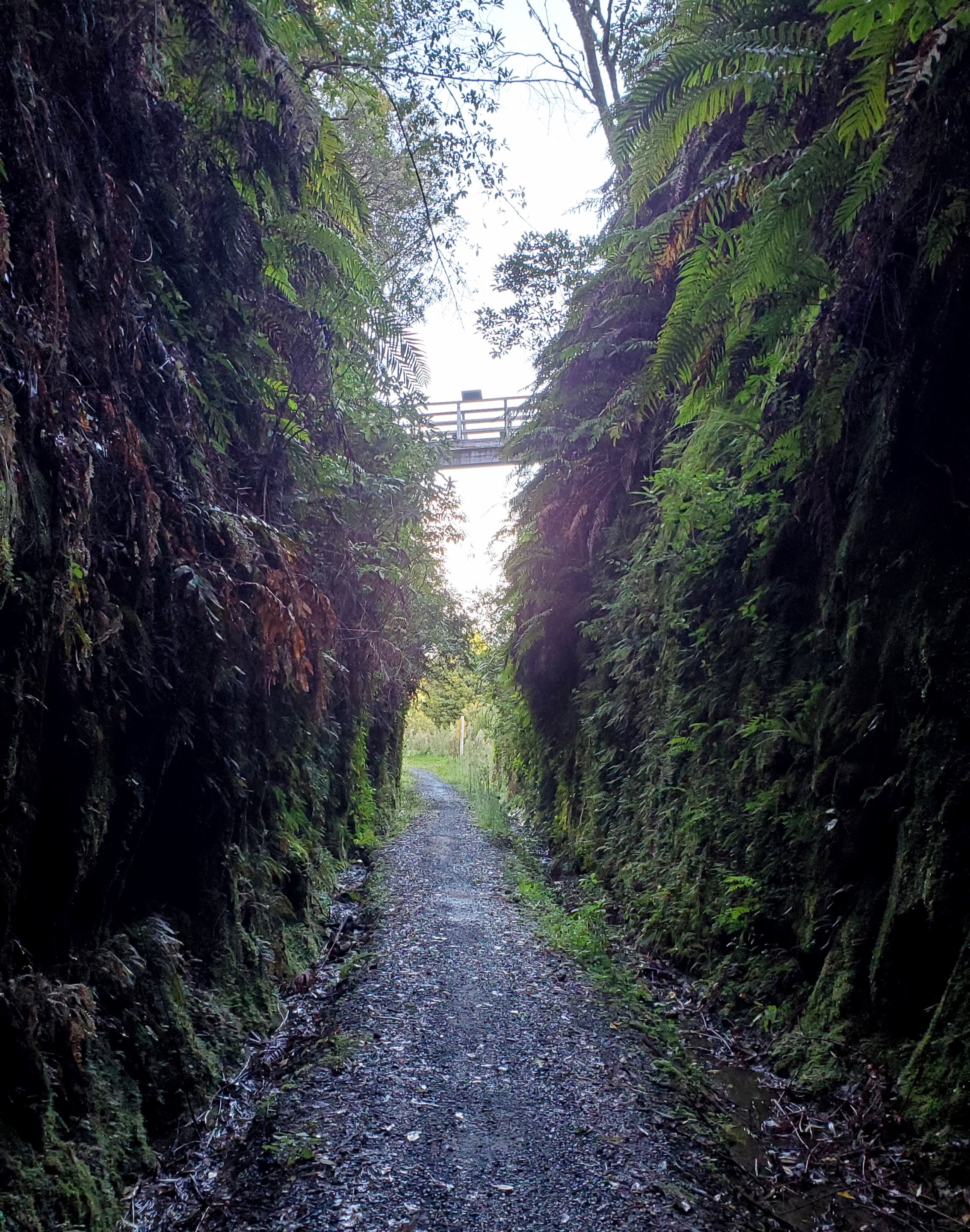 There were some amazingly tall cuttings along the way, more beautiful forest sections, and open parts that were more scrub again too. Towards the end one of the last features is the Ongarue spiral, which was quite the engineering feat back in the day. Basically the trail does a tight loop – easy on a bike but really difficult with logs on a train! It was difficult to capture in a photo, but it was cool to ride through the tunnel part and see the bridge above.