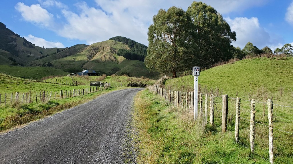 I passed the tiny township of Ongarue (population about 20 apparently) and turned onto an empty gravel road where the cycle tour obviously went too. Early on there were no houses, the odd driveway, but some paddocks with cattle. I vaguely wondered if today would be the day I encountered a cow on the road – it was that kind of deserted place. The state highway was much busier on the other side of the river and it was awesome to not have to be on that!