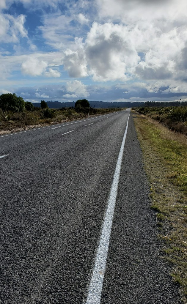 I ploughed on more carefully, constantly on the lookout for trees but seemingly that was the only one. Finally the end of the track appeared, and I had a break to prepare for the road walk into National Park. It was 6 kilometres on state highway 47 of hoping Jamie didn’t jump out of a vehicle passing by. There wasn’t that much traffic though, sometimes the verge was pretty good, other times I seemed to be weaving in and out of harakeke plants and the ditch. Unlike yesterday, I could see my destination – a tiny pin prick in this photo, but it’s there!