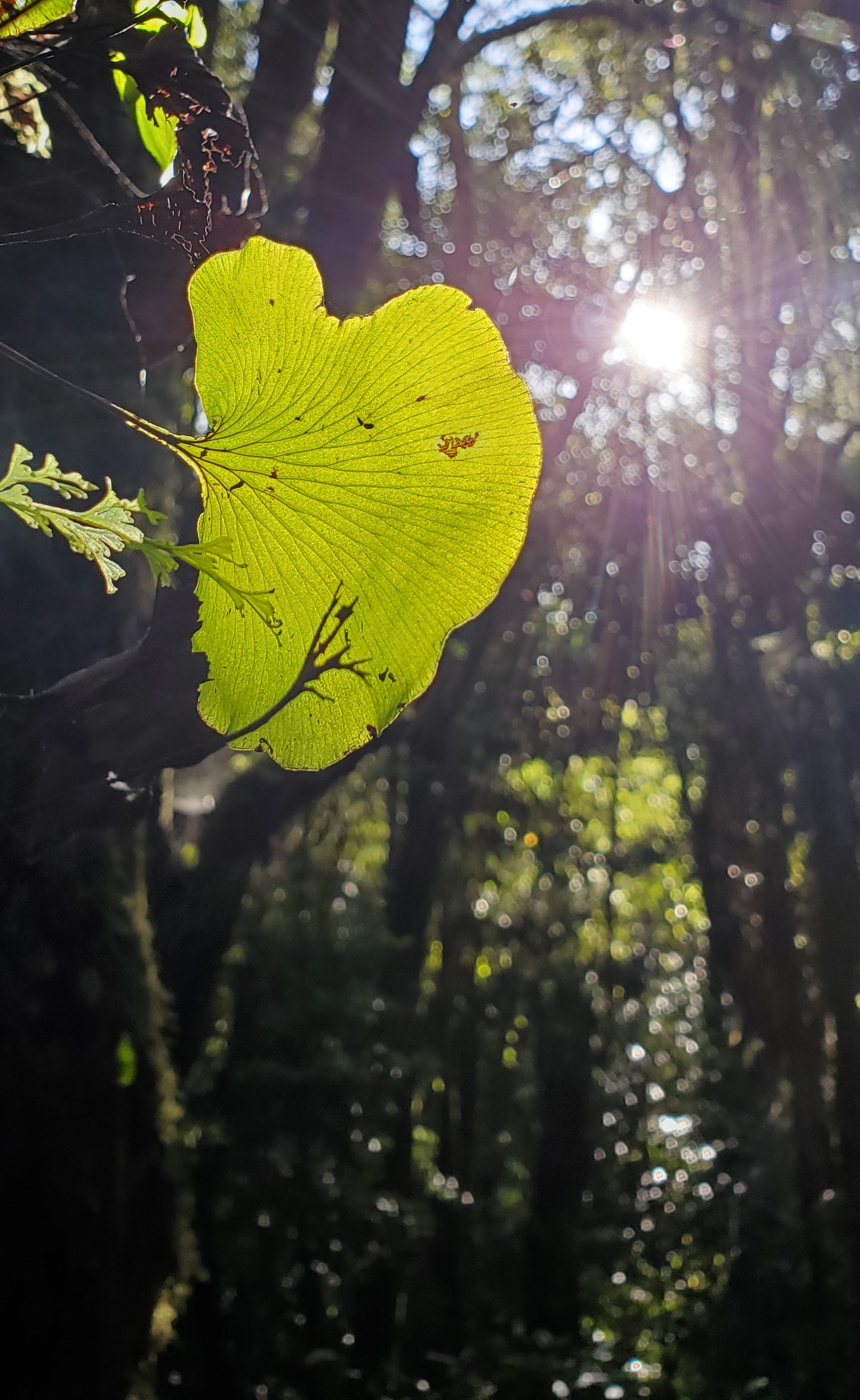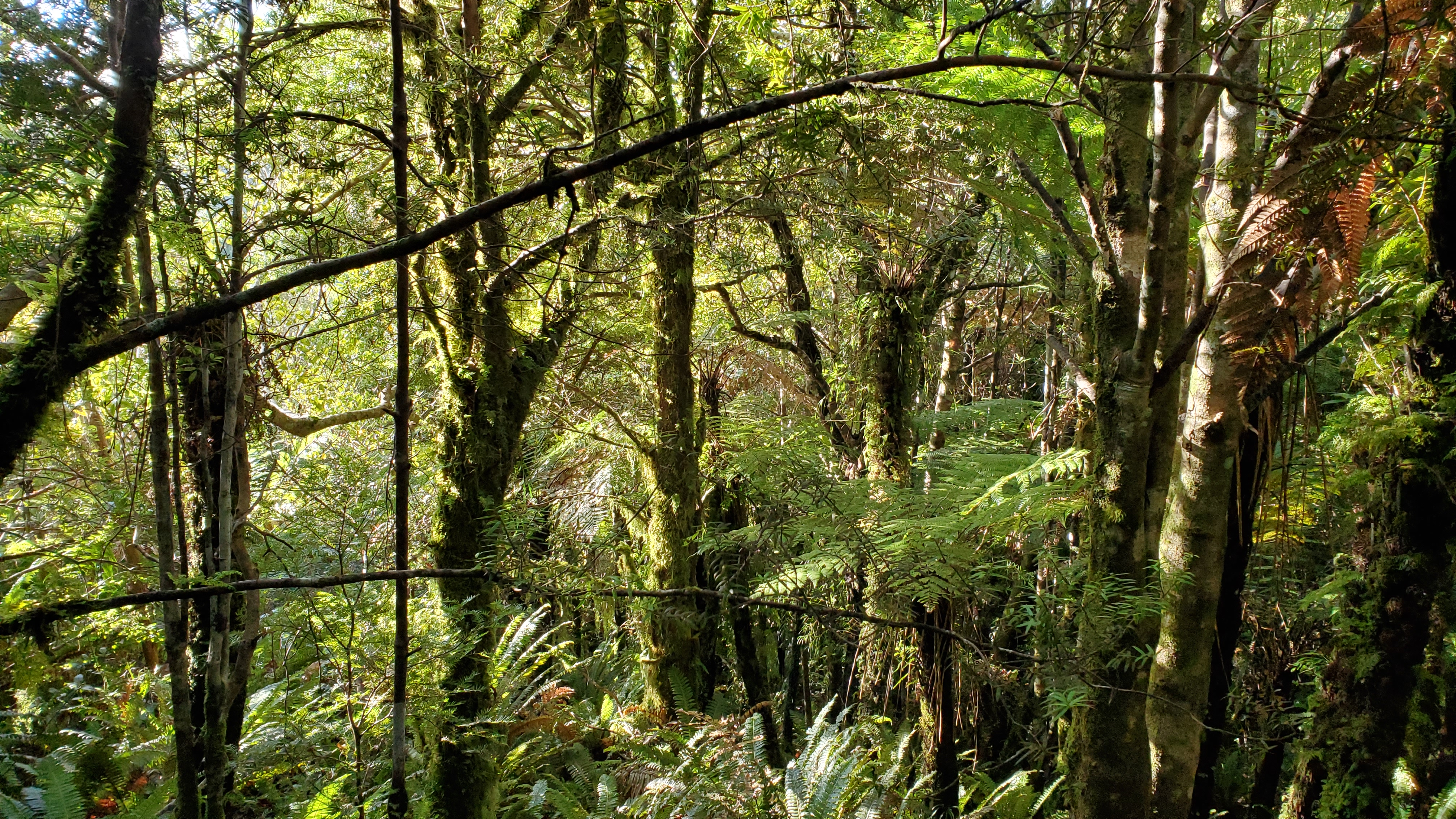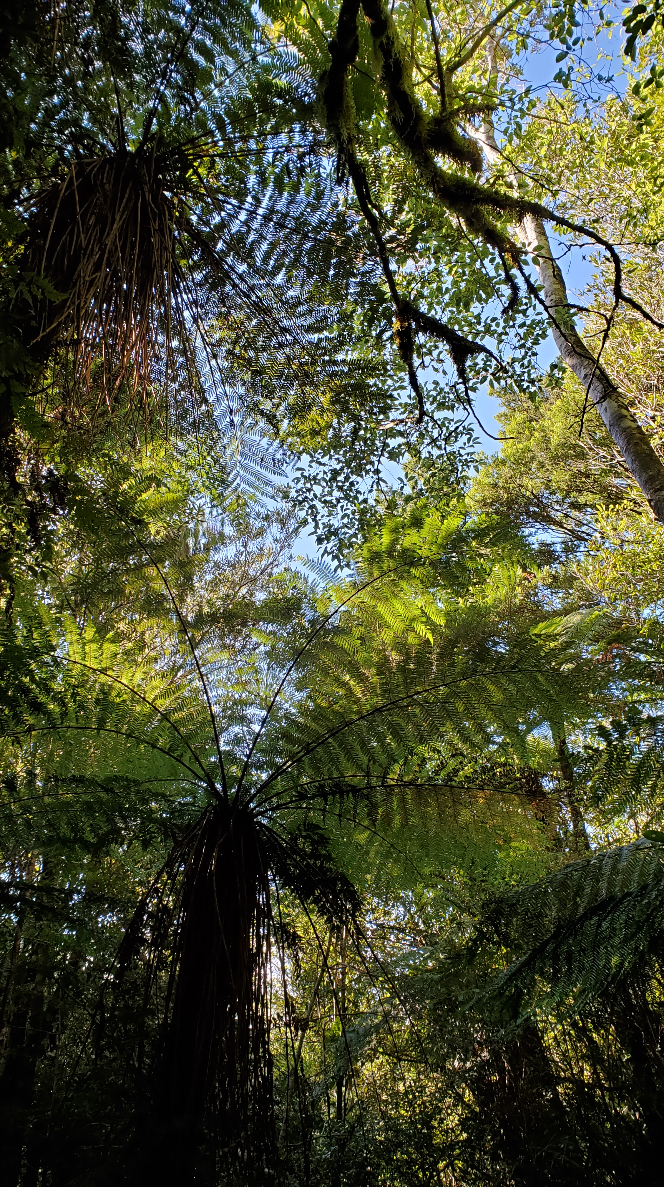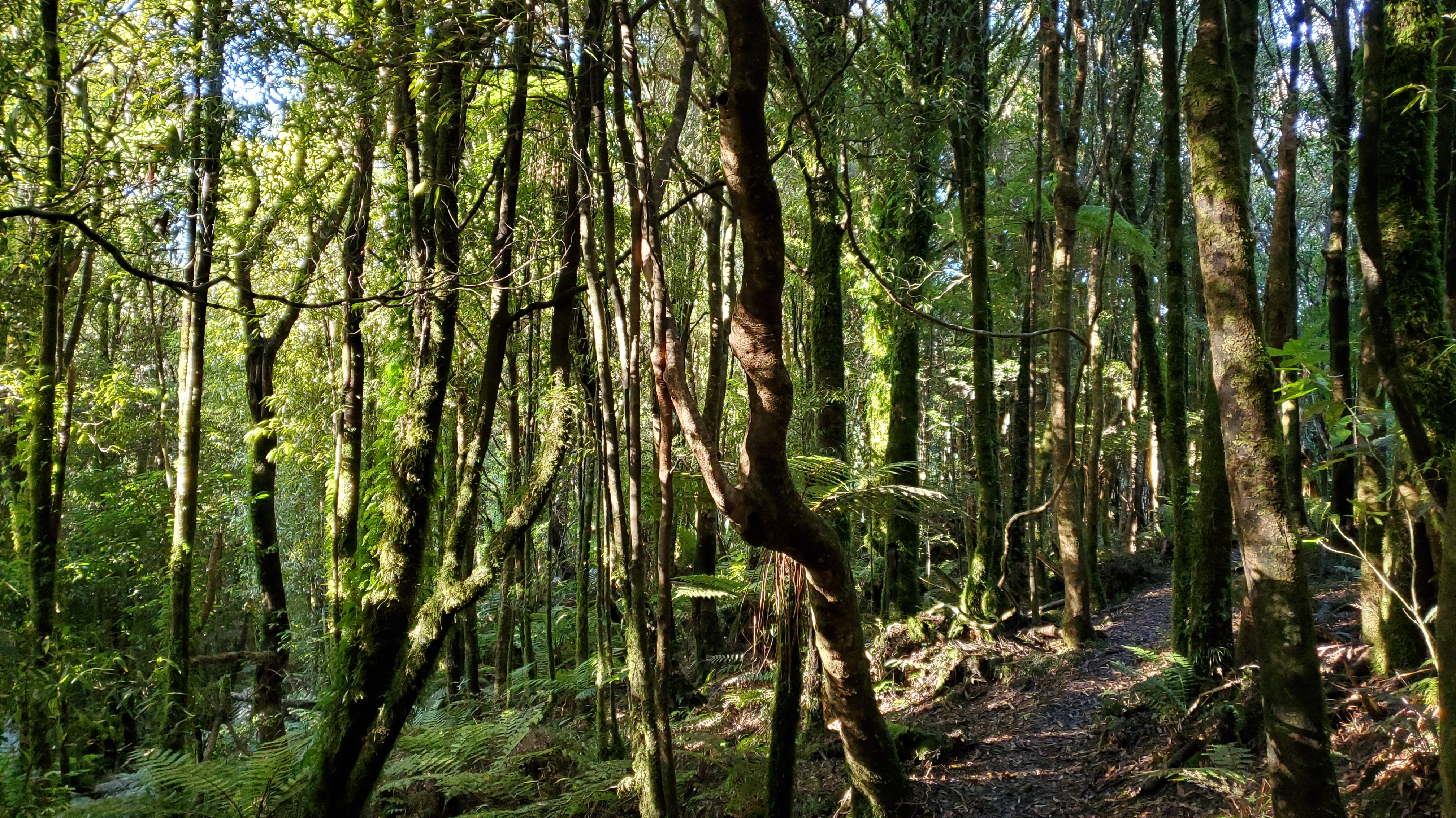 Stephen appeared, which distracted it momentarily but like a boomerang it was back. A few hundred metres up the track, I turned around feeling obligated to walk the dog back to the caravan. Pieter appeared and mentioned the owner had said to send it home, as I mumbled that I was just going to walk it back. He said in a firm voice twice “go home dog!”, and it turned and promptly did! Phew! Why didn’t I try that?! I set off again but realised after 5 minutes I’d left my camera on the DOC signpost, and headed back down the hill again. As Pieter said, it seemed I really just didn’t want to start this track!! I focussed on the beautiful forest in the early light and hoped there weren’t more mishaps to come.